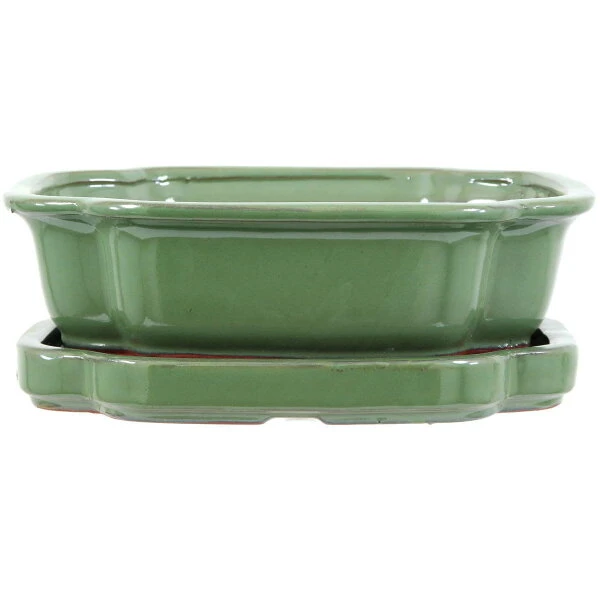 Bonsaischale mit Untersetzer (glasiert, hellgrün, sonstige form) in den Abmessungen: 25cm Länge, 20cm Breite, 8cm Höhe. Gute Standardqualität aus der Töpferstadt Yixing.
