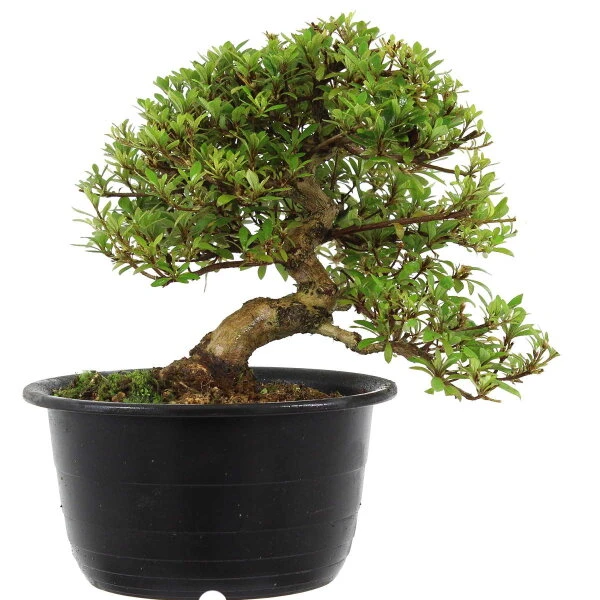 18 Jahre alte Japanische Satsuki Azalee (Sorte: Sachin) in einer Kunststoff Bonsaischale. Dieser Bonsai ist ca. 30cm hoch und wurde aus einer japanischen Bonsaigärtnerei importiert.